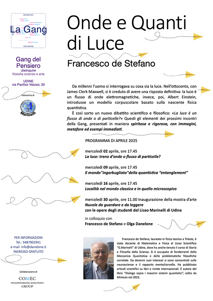 Gang del Pensiero, gruppo di cultura partecipata, dove tutte le persone condividono saperi e opinioni. Lo scopo è di ricevere e condividere saperi e competenze. Ascoltandosi vicendevolmente in maniera costruttiva e leggera,  lasciando scorrere le idee in parole che, rapportate al tepore dolce di una corrente d’aria estiva, rinfrescano e rinnovano il piacere dello scambio reciproco.
